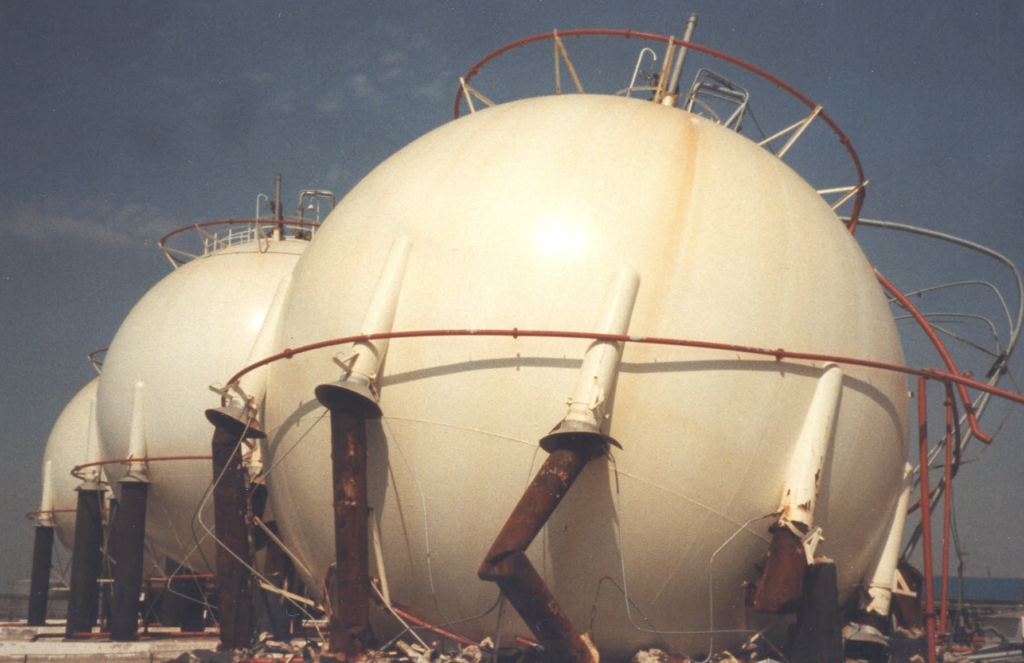 BonPEC allows for a good evaluation of the integrity of Spherical Tank Support Legs through its fireproofing. When the support legs are not considered or not good examined, there may be serious consequences for the integrity of the structure that may collapse during a water test prior to its going back to service (see the image). Water is generally heavier than the liquefied gas product stored in this Pressure Vessels types.