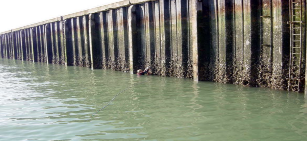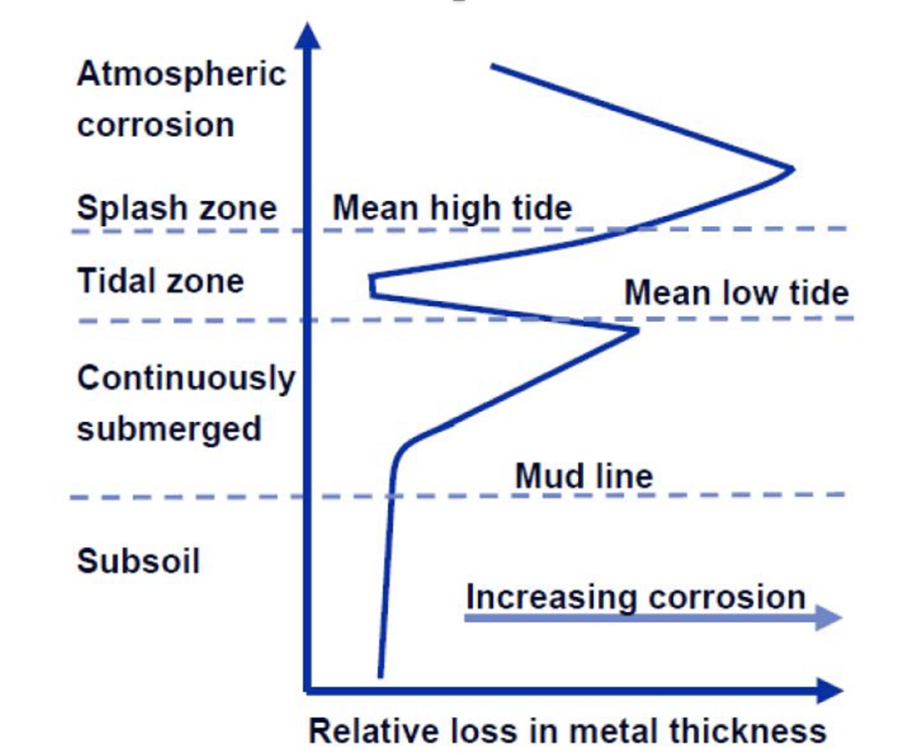 Corrosion degradation of these structures may be also as consequence of high-low tide, fresh and saltwater mixing and it may be more aggressive in the Splash Zone due to the higher concentration of Oxygen. Damages can also be mechanical due to ship movements and impacts.
