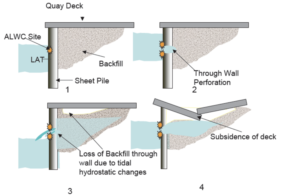 Corrosion and degradation of Steel Sheet Piling is a continuous deterioration process that may lead to serious safety, economical and legal consequences for Port and Waterways Authorities. If not monitored and controlled during their service life, serious degradation can be expected after only 10 years of operation for example due to accelerated degradation processes such as Accelerated Low Water Corrosion (ALWC), a form of corrosion caused by microbial growth that can occur on inshore, tidal, marine, steel piled structures. Its consequences can be expensive, often requiring costly remedial works and unplanned facility downtime. Corrosion rates in excess of 3 mm/year have been observed and if left untreated can results in the integrity of the facility being seriously compromised.