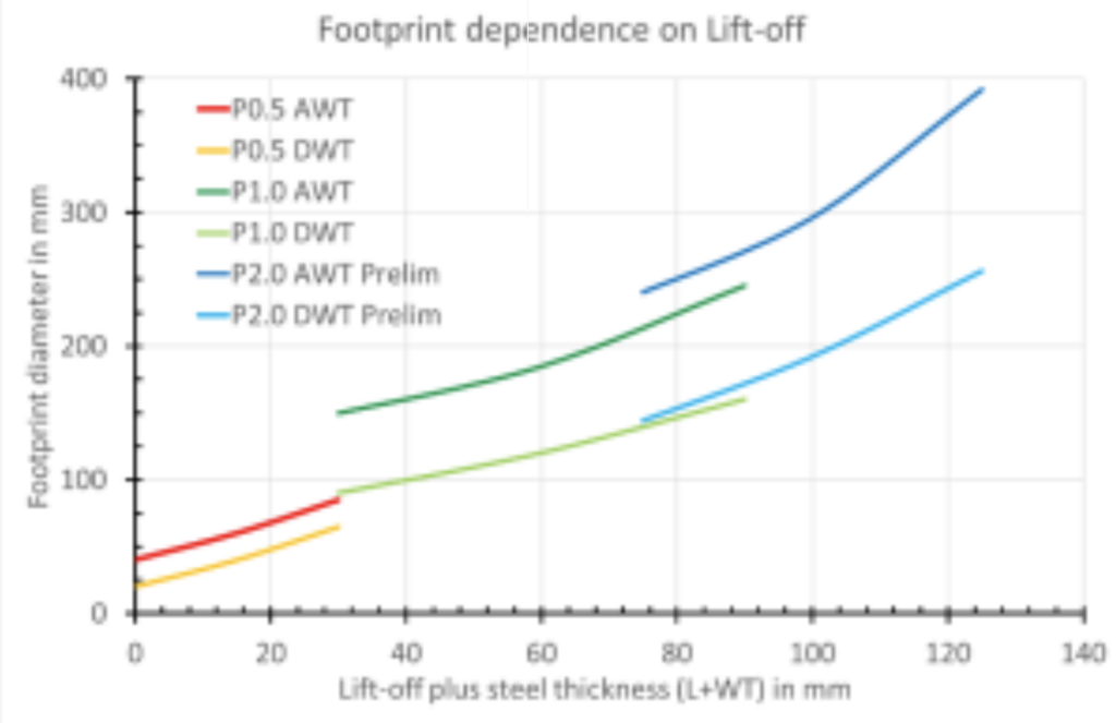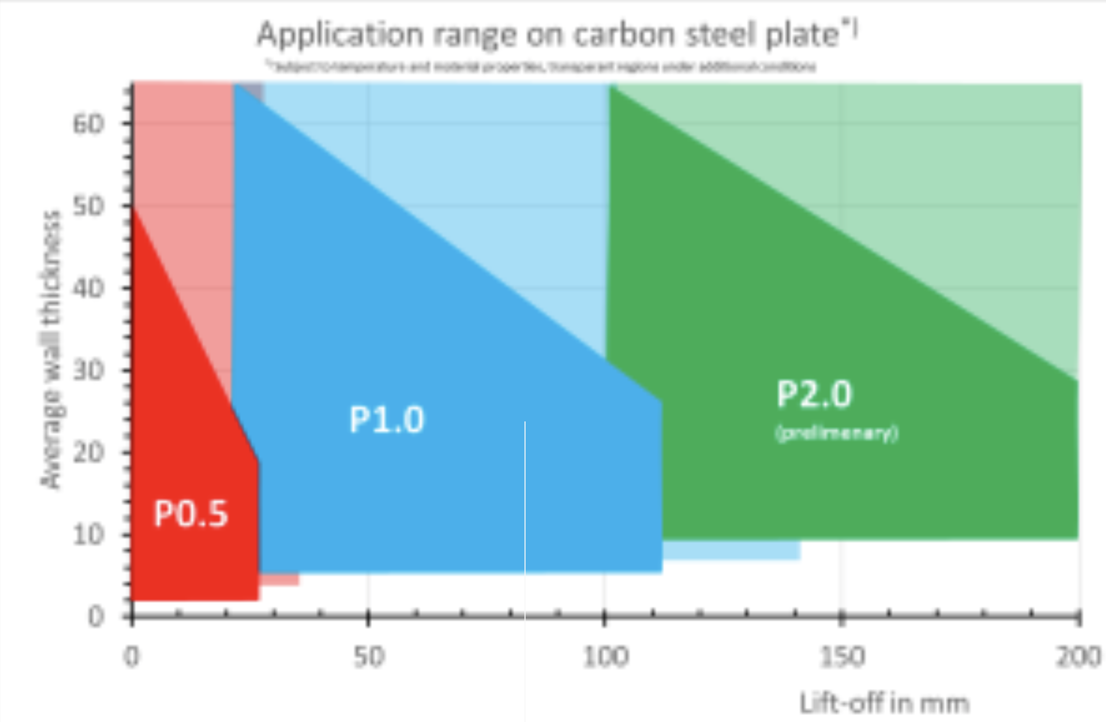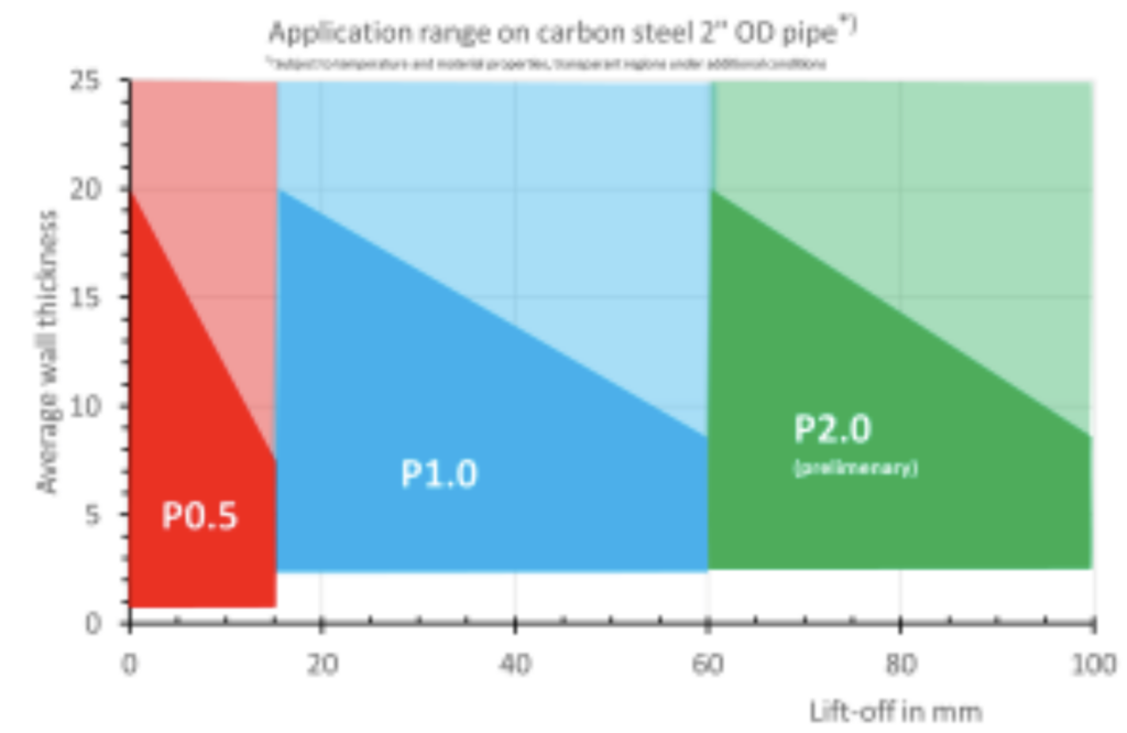 Depending on the lift-off and the average wall thickness of the object to investigate, a choice must be made about which probe to use to optimize the reliability of the inspection. For a large lift-off a large probe is needed. Two probes are directly available P0.5 and P1.0, another probe for even larger lift off is under development (P2.0). The applicable range of each probe depends on the material properties and the geometry of the component to be inspected. The most important parameter are the lift-off and the average wall thickness of the component to be examined.